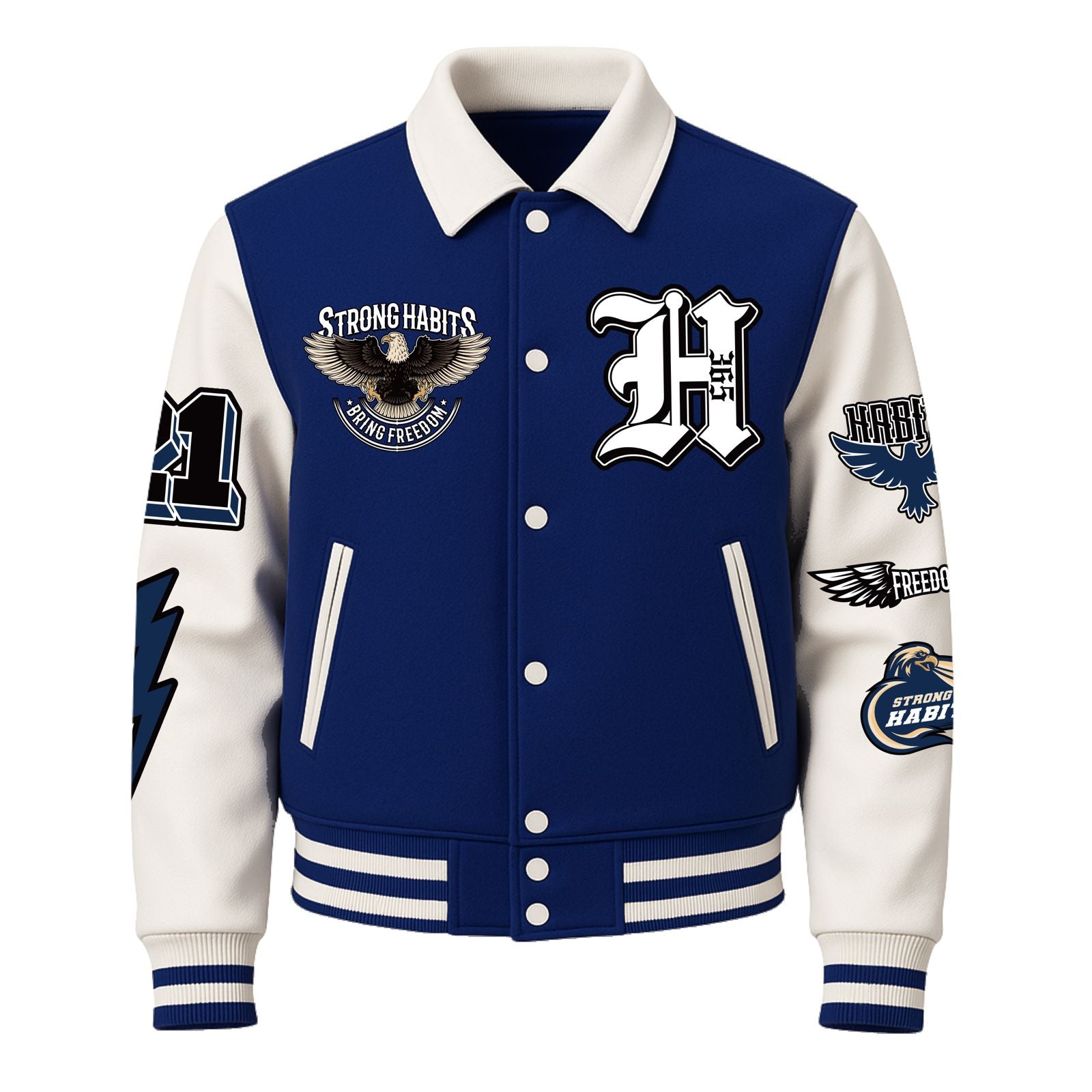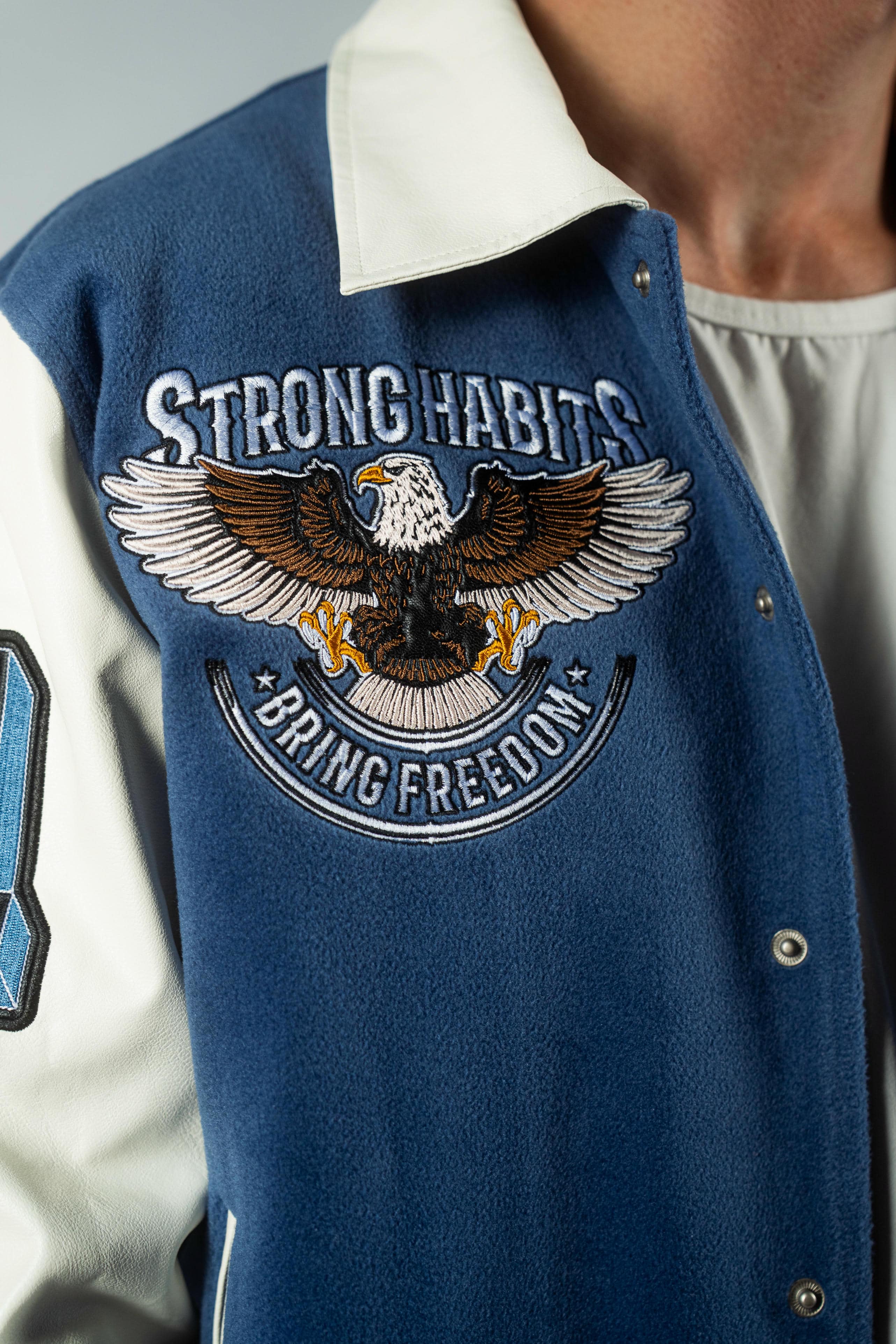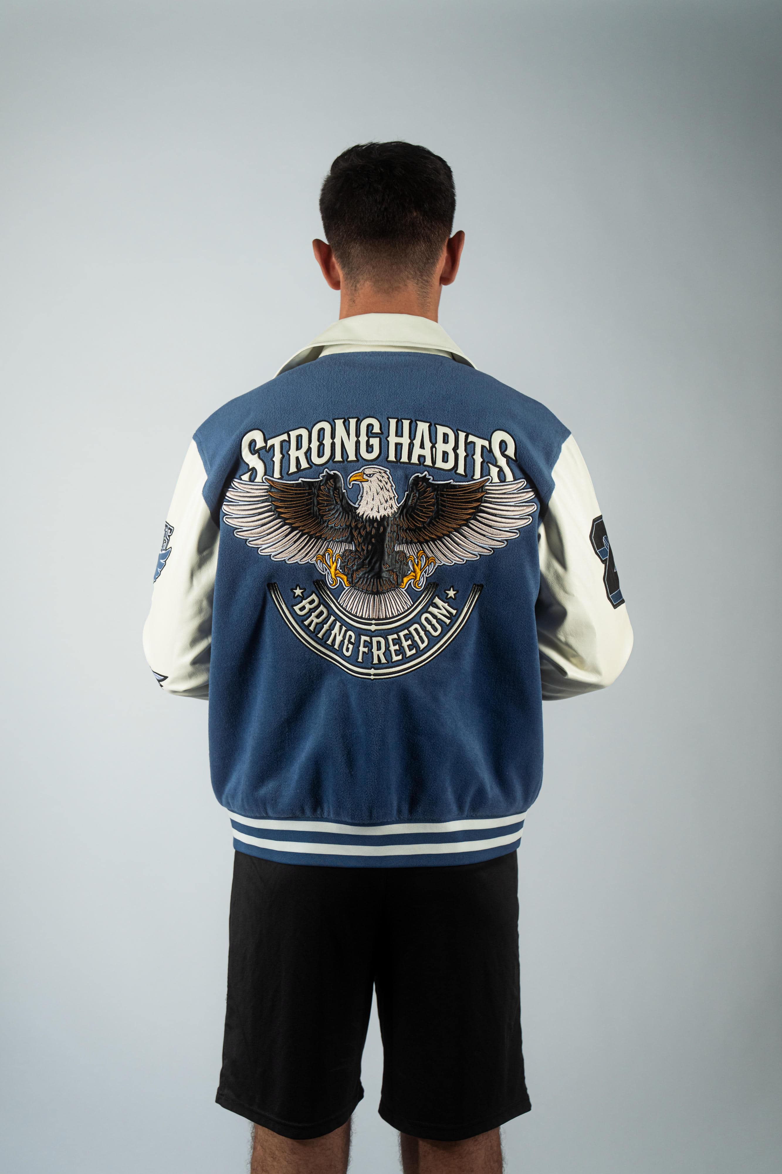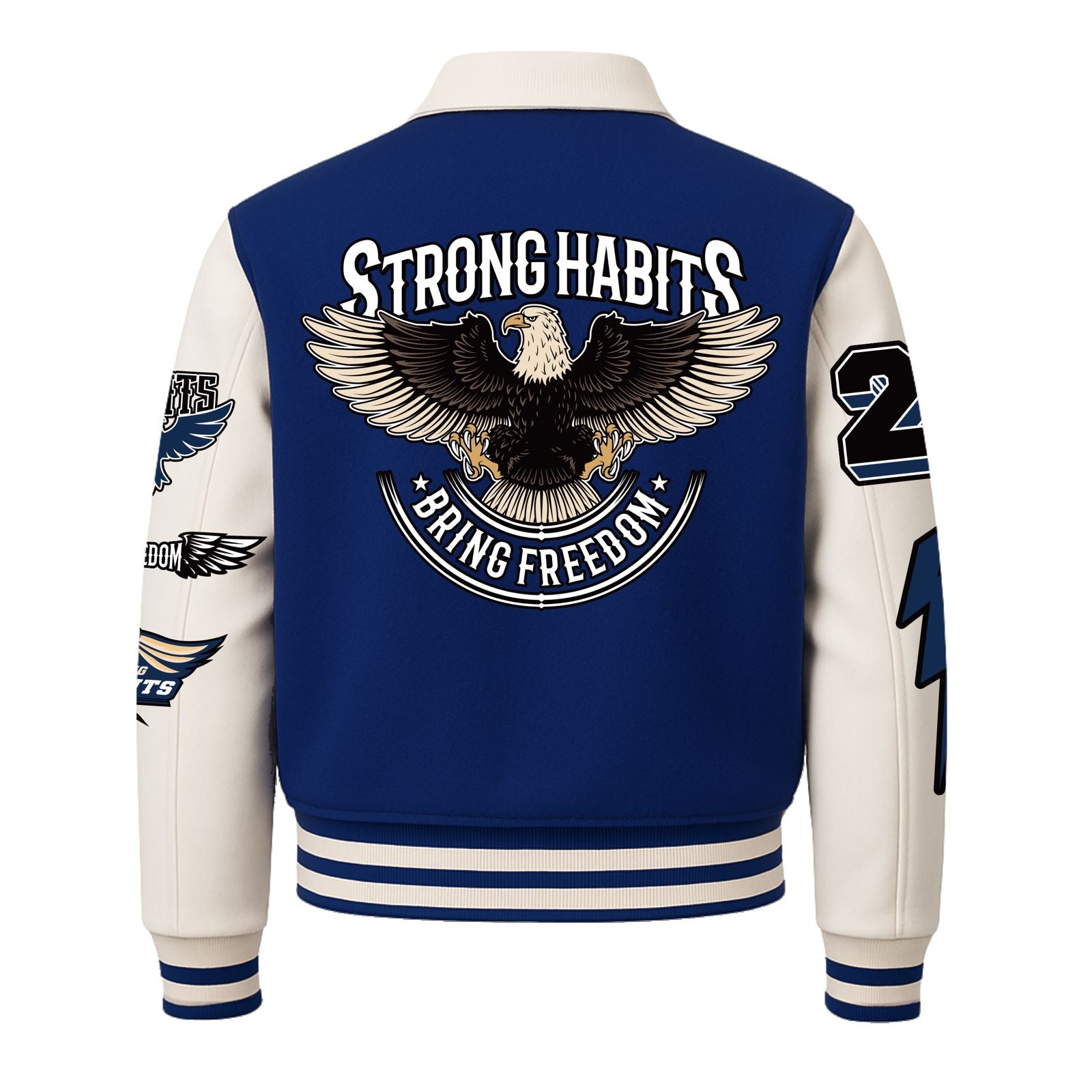 Design: Premium embroidered patchwork front and back featuring our “Strong Habits. Bring Freedom.” eagle graphic—symbolizing bold discipline and high-flight ambition.